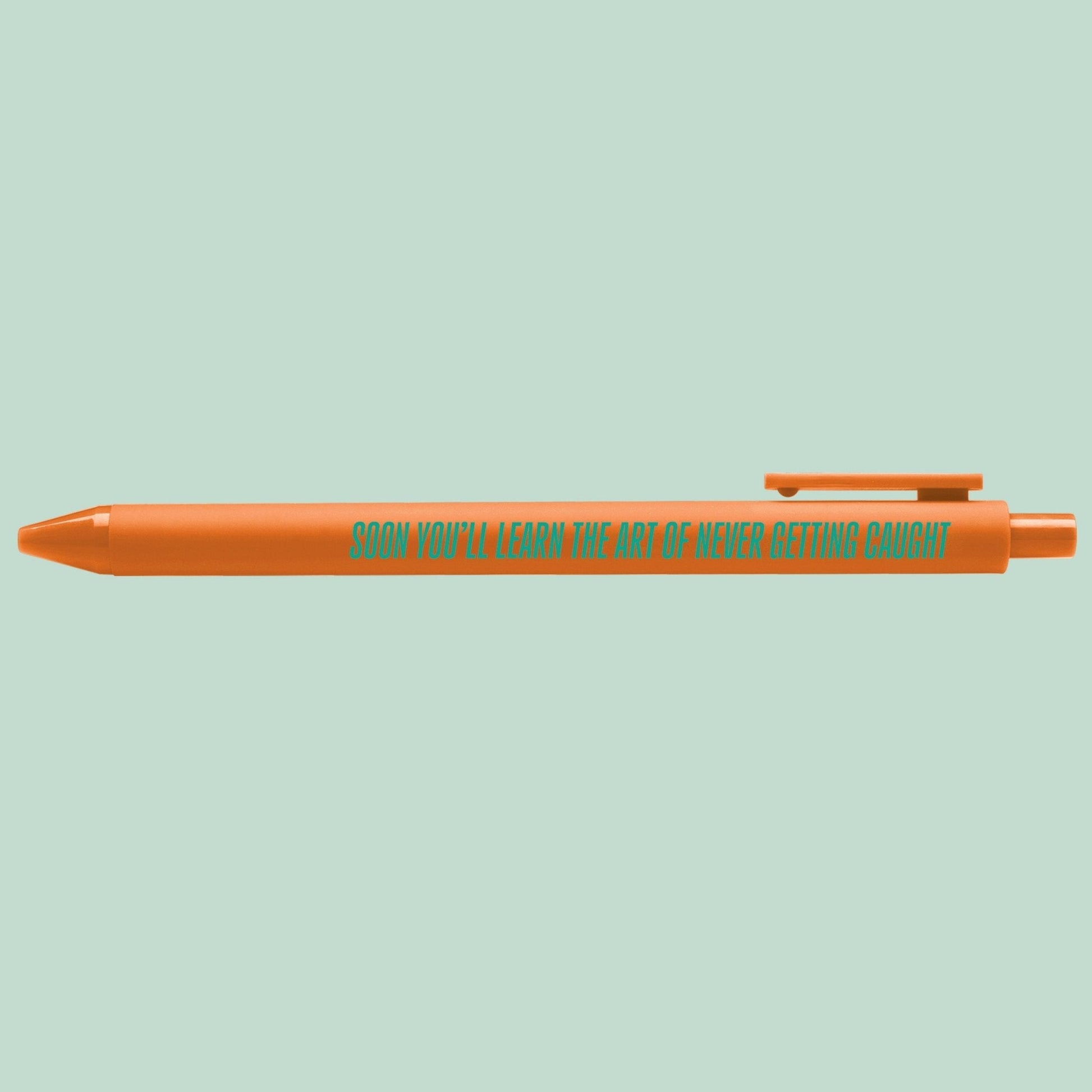 Soon you'll learn the art of never getting caught - orange barrel, teal text 0.5mm fine point