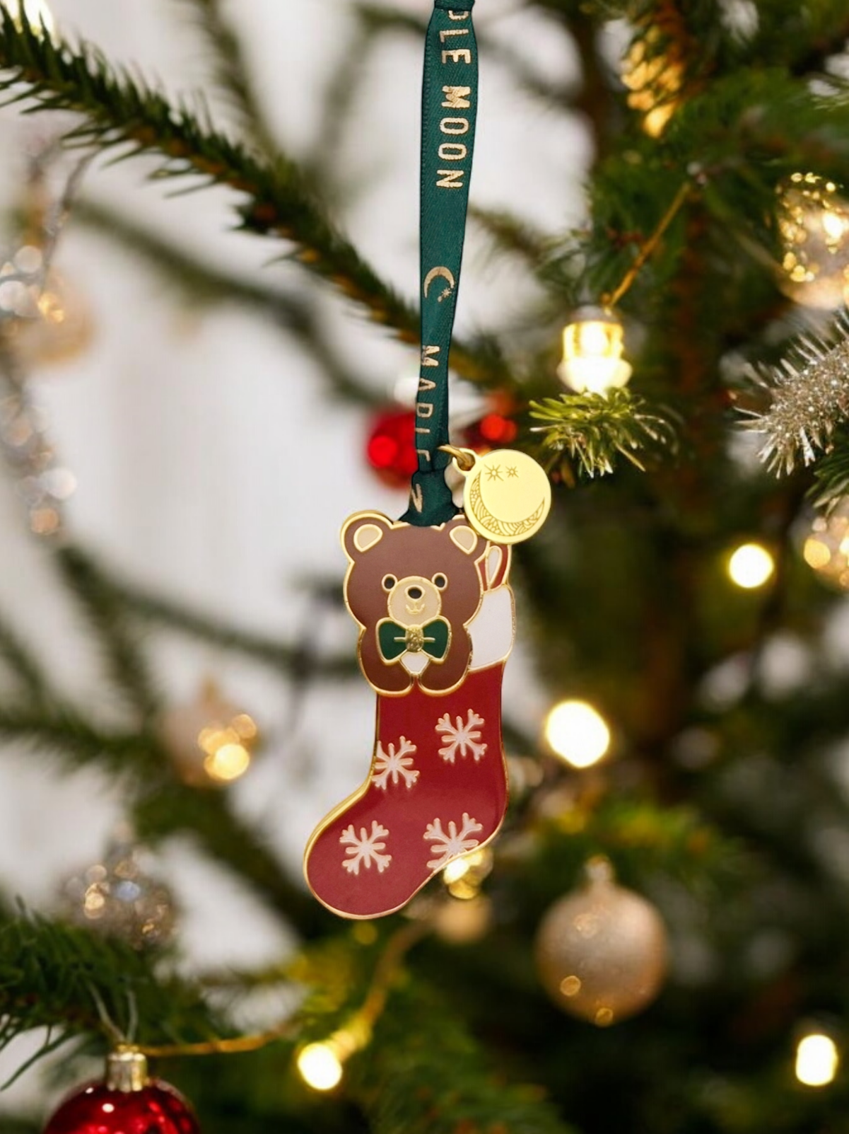 Add some festive fun to your tree with this adorable teddy bear in a stocking enamel decoration.