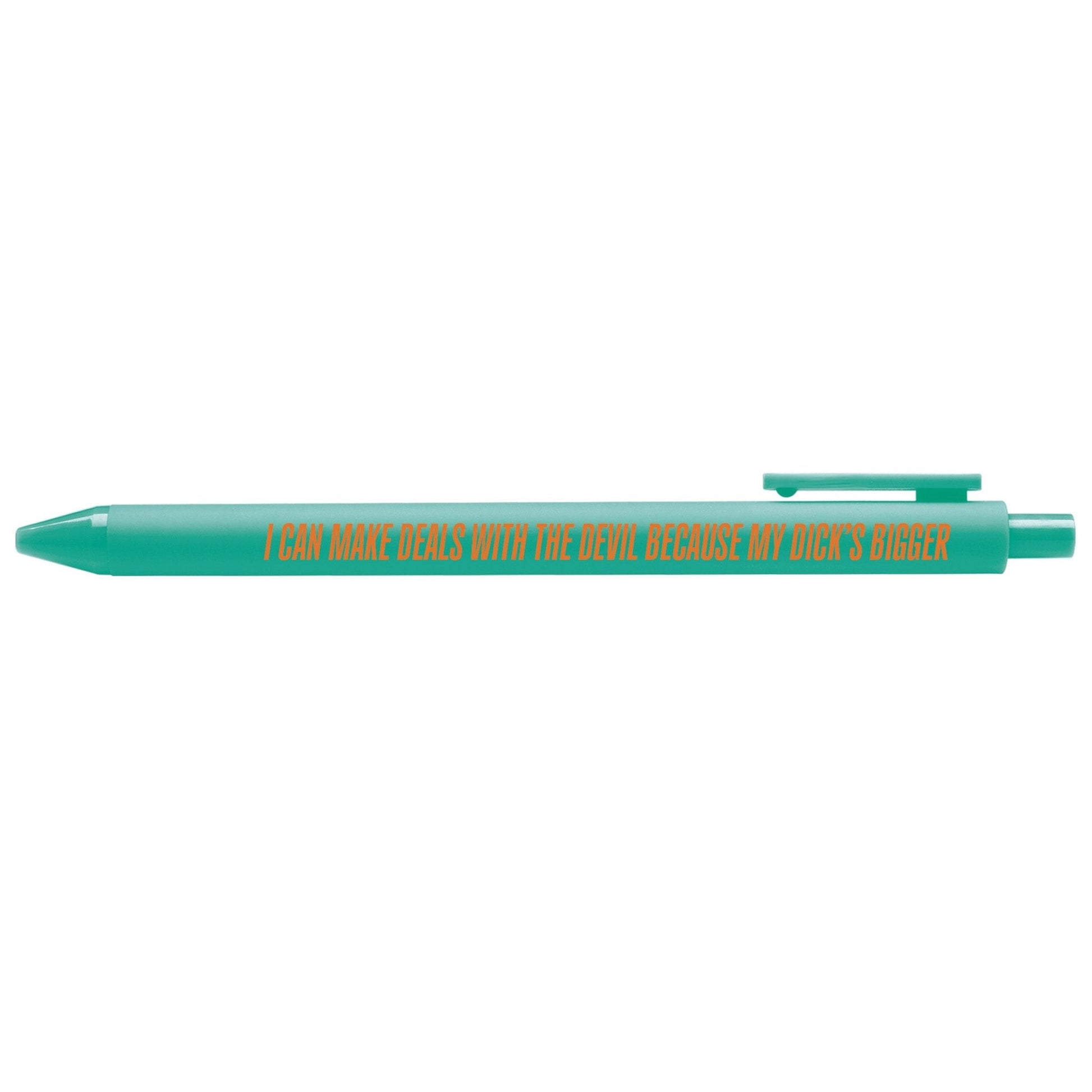 I can make deals with the devil because my dick's bigger - teal barrel, orange text 0.5mm fine point