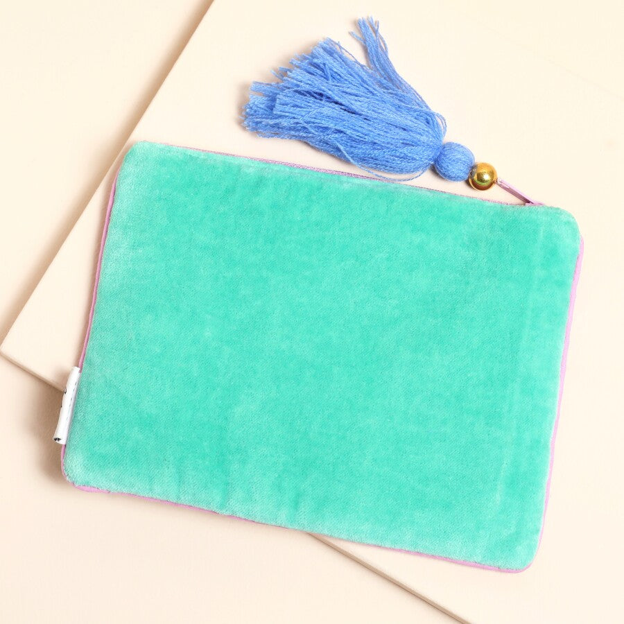 Featuring the playful slogan 'cats before twats' with a cute curled-up cat design, it’s a bold statement piece. The purse boasts a fun grid print with a mint ric-rac trim around the bottom, and the velvet back adds a soft, luxurious touch. Finished off with a purple fluffy tassel that’s just begging to be batted at, it’s as fun as it is functional.