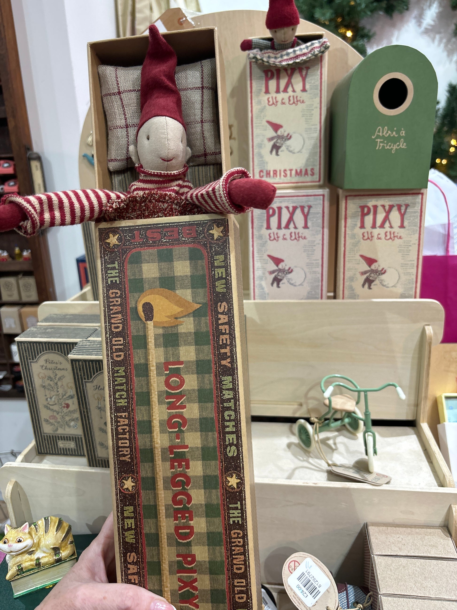 A new Pixy style has been added to the classic pixy collection. This Pixy wears a knitted suit and has magnets in its hands so it can hang or sit everywhere. It comes in a decorative matchbox with soft bedlinen inside.