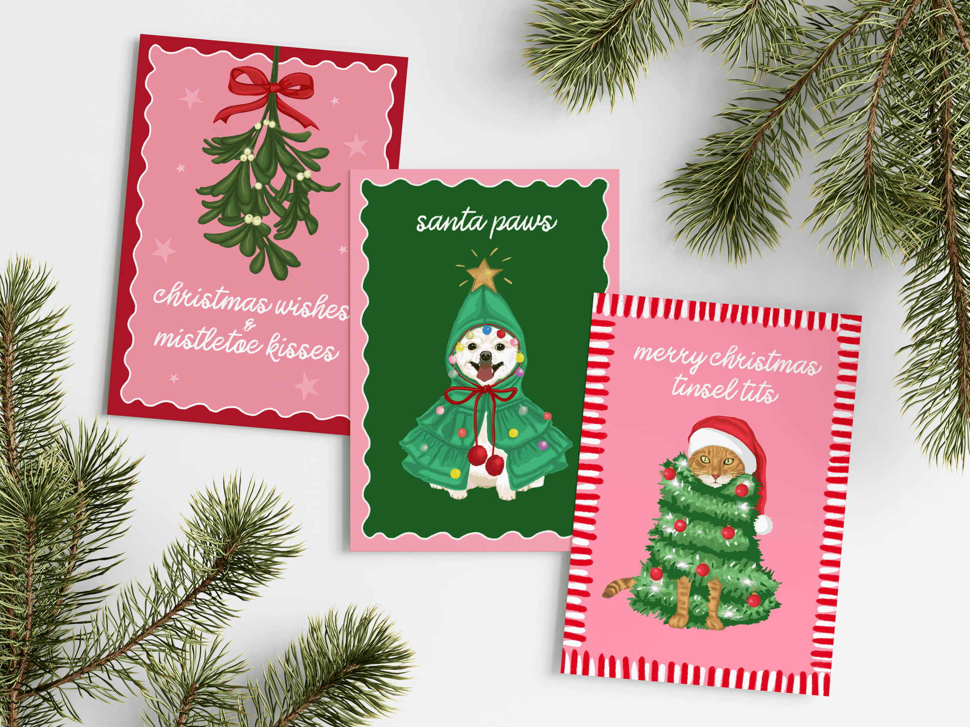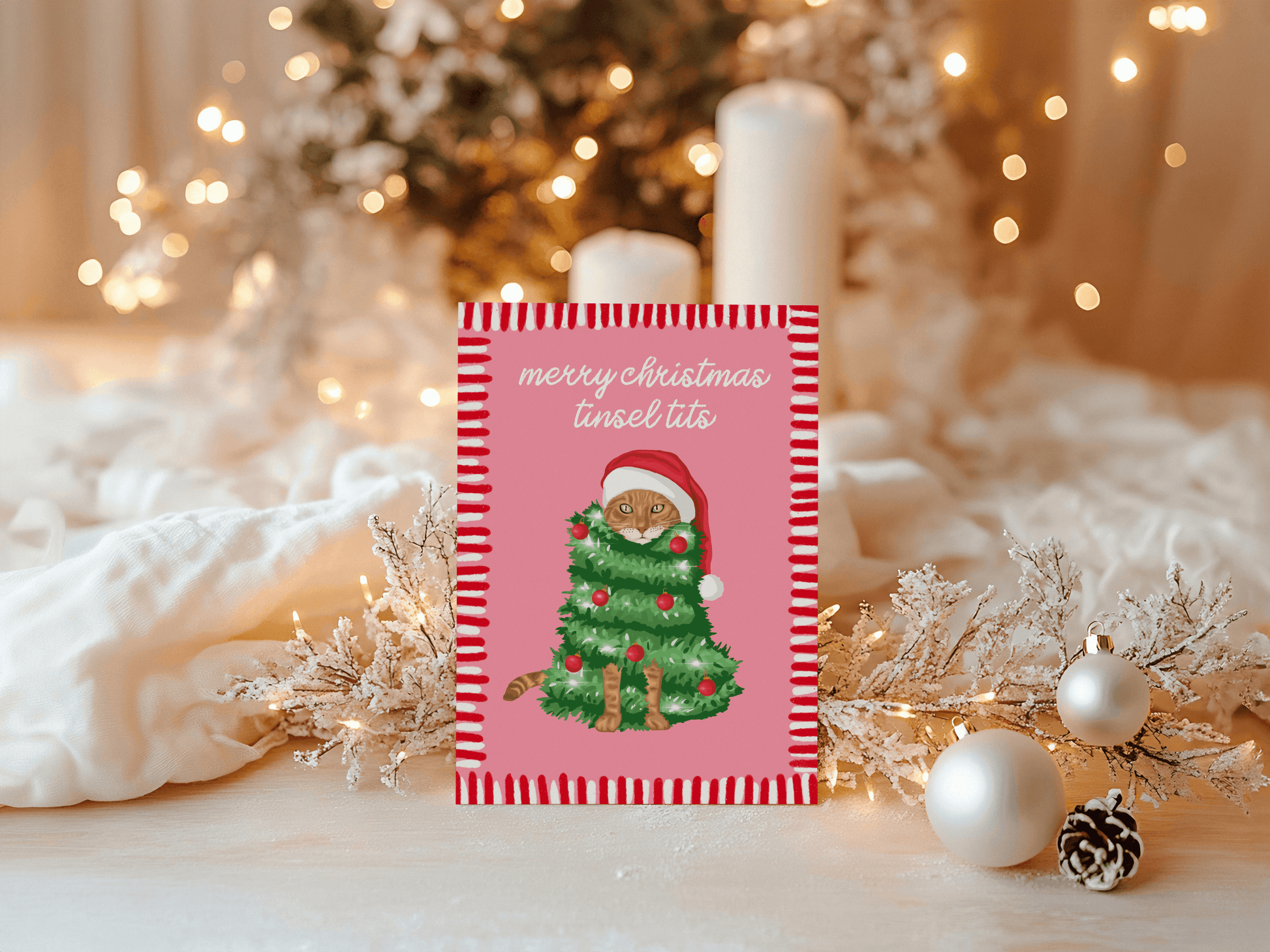 Merry Christmas Tinsel Tits Cat Illustrated Christmas Card