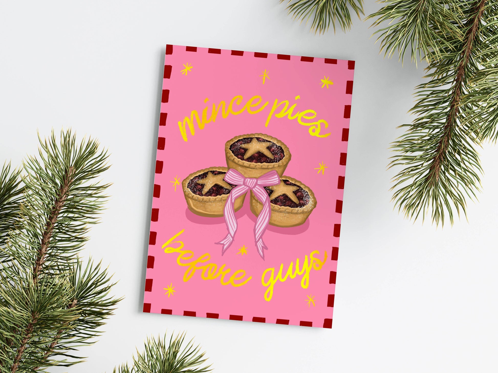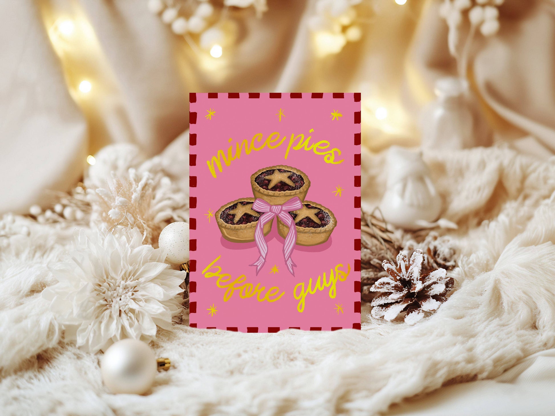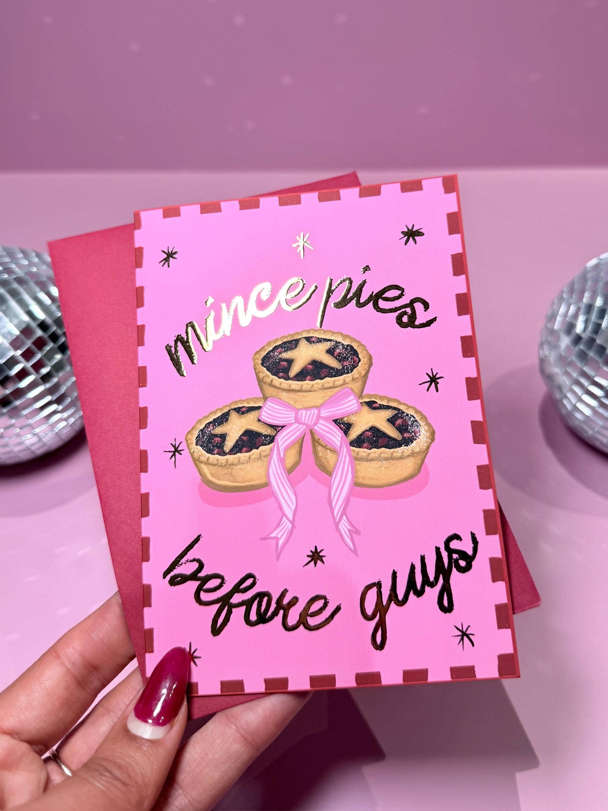 Mince Pies Before Guys Gold Foil Christmas Card • Gold foil card with hand illustrated design • Left blank for your own message/ envelope included • Delivered in protective packaging • A6 card size: 148 x 105mm / Printed on 300gsm A6 card
