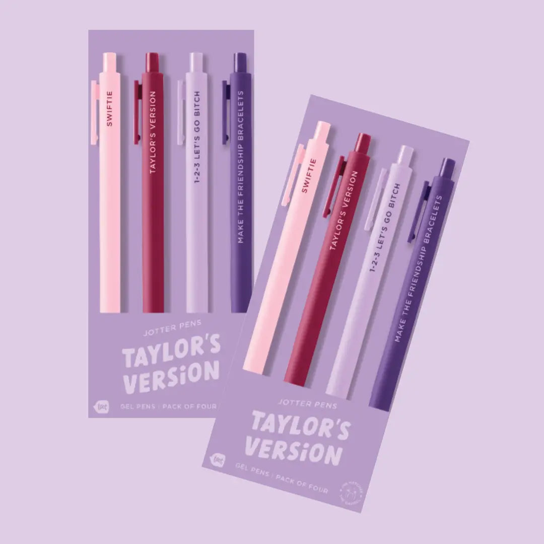 Our best-selling soft-touch barrel surface and fine-point gel tip now have a Swiftie flare. *MOST* pens write in colored gel ink that matches the barrel, with the exception of: White, Gray, Silver, Gold, Rose Gold, Navy-- those write in Black.