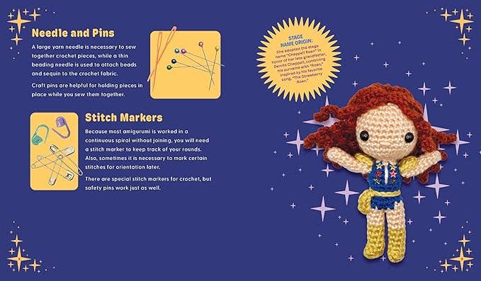 The Unofficial Chappell Roan Book and Crochet Kit includes all the instructions and materials you need to make your own amigurumi Chappell Roan doll, styled in a signature look from her “HOT TO GO!” music video: a blue sequined leotard with gold boots and her iconic curly red hair.